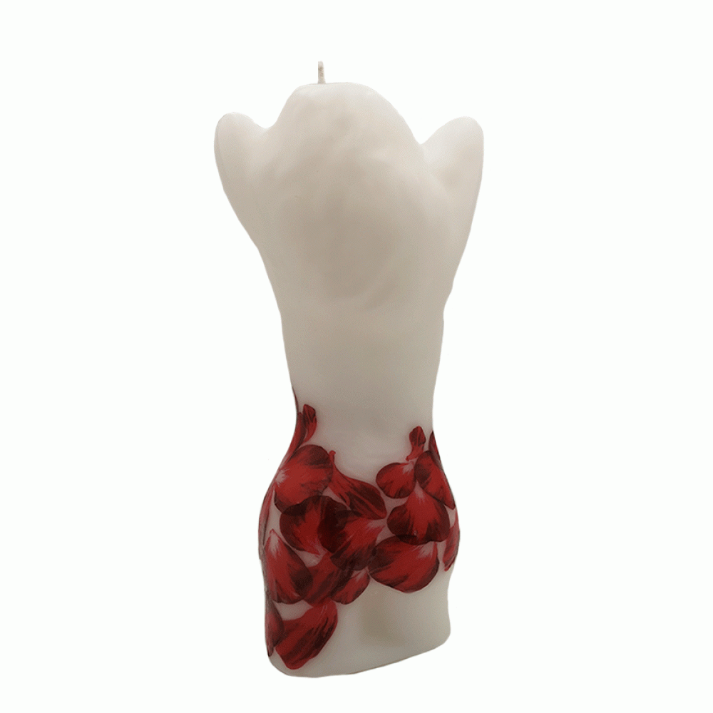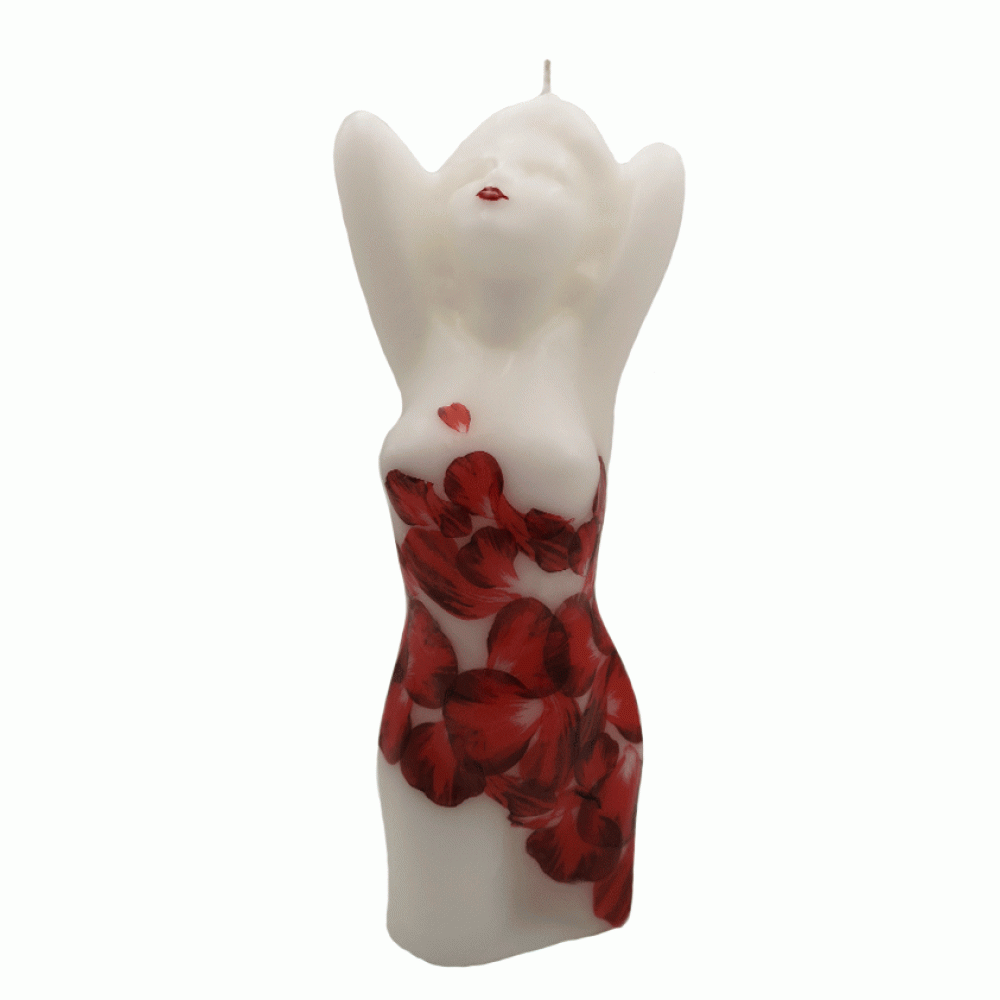 Sexy dame in rode rozenblaadjes jurk. Een kaars in de vorm van een mooie dame. Figuurkaars eigen design. Een mooie en originele geschenk voor jezelf of voor een ander. Een mooi Kunst beeld als woonaccessoire passend in bijna elke woninginrichting. Of een beeld om cadeau te geven als: Verjaardag, Relatie, Huwelijks, Jubileum, Vriendschap, cadeau of geschenk.