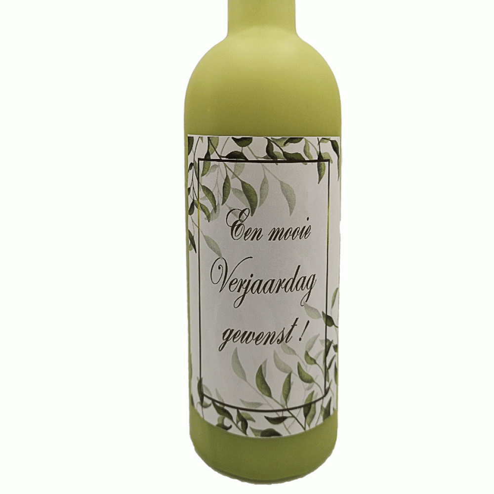 De flesvormige kaars van de wijn met een leuke boodschap voor jarige.