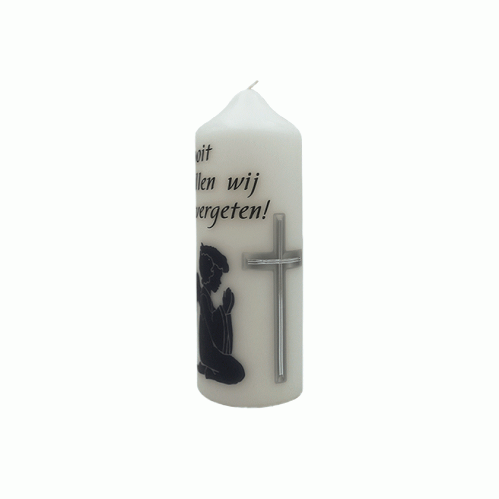 Een mooie witte kaars met een rouw tekst en foto van Engel. Zet deze kaars bij het altaartje of herdenkingsplekje in huis. Deze kaars is ter nagedachtenis. Het is voor de nabestaande altijd erg fijn als ze een condoleance kaars ontvangen, dan weten ze dat ze er niet alleen voor staan. Herinnerings kaarsen zijn zeer geschikt om te geven als een cadeautje voor troost en om te laten weten dat je aan iemand denkt. Ze laten een lichtje branden in de donkere tijden. Een herdenkingskaars aansteken is een middel om concreet wat te doen met iets wat zo onzeker, vaag en ongrijpbaar is als de dood. Het maakt het gemis van een dierbare tastbaar. Bij een afscheidsplechtigheid, bijvoorbeeld in de aula van het crematorium of begraafplaats, is het kaarsenritueel een van de meest gebruikte rituelen.