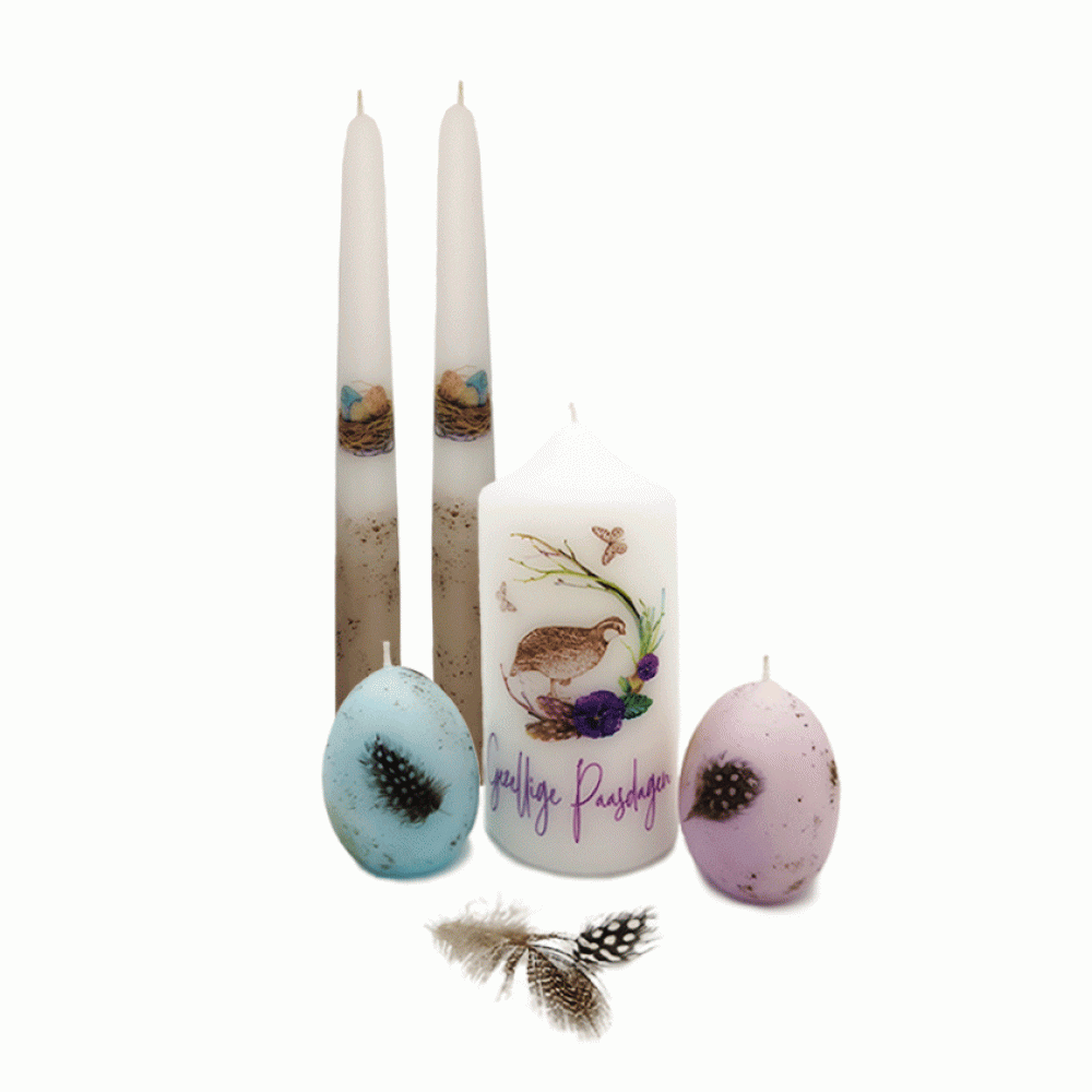 Deze mooie Paaskaarsen twee paaseieren, twee gotische kaarsen en een stompkaars set van 5 stuks zijn namelijk de perfecte basis voor je feestelijke paastafel. Sfeervolle vrolijke kaarsen met mooie paas afbeeldigen voor op je feest tafel. Paasversiering met mooie paaskaarsen, paastafel dekken met mooie paaskaarsen, paastafel versieren en decoreren, dat kan met deze exclusieve handgemaakte paaskaarsen. Maak iedereen blij met deze vrolijke Paaskaarsen. leuk voor jezelf of als cadeau, want we verpakken deze kaarsen in handige cadeau folie voor een mooie uitstraling. Deze exclusieve kaarsen zijn door het eigen design zeer exclusief. Kaarsen kenmerken zich door de warme en sfeervolle uitstraling en zijn zeer geschikt voor diverse gelegenheden.