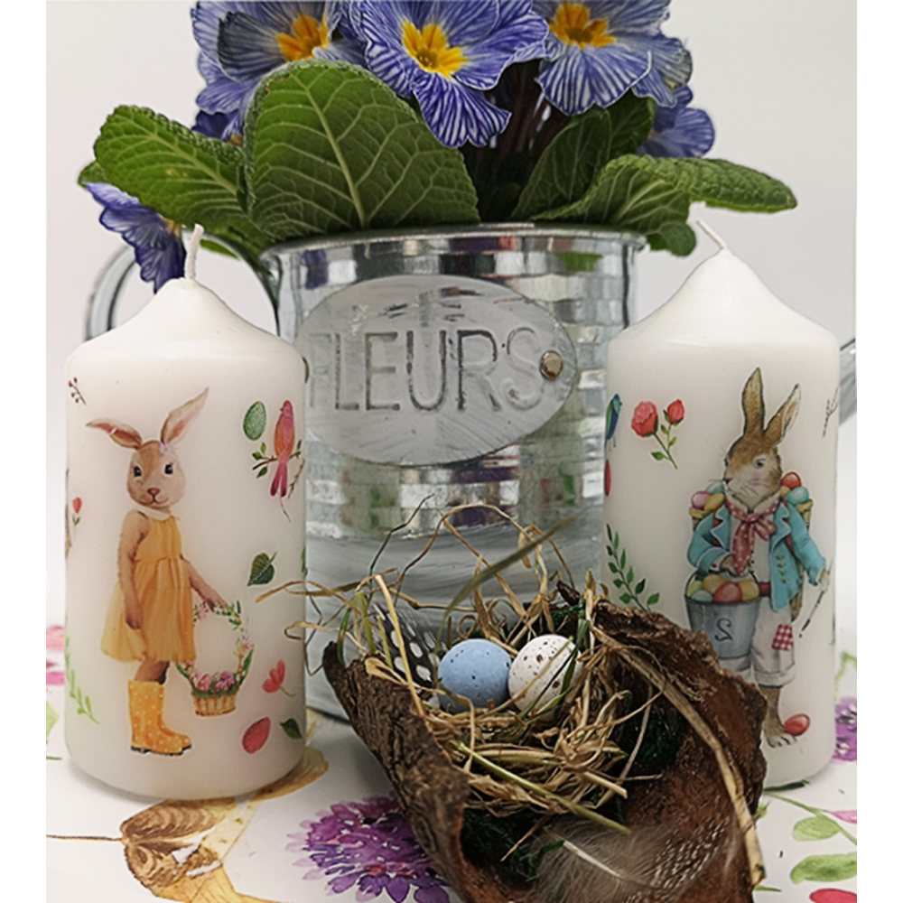 Sfeervolle vrolijke kaarsen met mooie paas afbeeldigen paashazen voor op je feest tafel set van 2 stuks. Paaskaarsen zijn namelijk de perfecte basis voor je feestelijke paastafel. Paasversiering met mooie paaskaarsen, paastafel dekken met mooie paaskaarsen, paastafel versieren en decoreren, dat kan met deze exclusieve handgemakte paaskaarsen. Maak iedereen blij met deze vrolijke Paaskaarsen. leuk voor jezelf of als cadeau, want we verpakken deze kaarsen in handige cadeau folie voor een mooie uitstraling. Deze exclusieve kaarsen zijn door het eigen design zeer exclusief. Kaarsen kenmerken zich door de warme en sfeervolle uitstraling en zijn zeer geschikt voor diverse gelegenheden.
