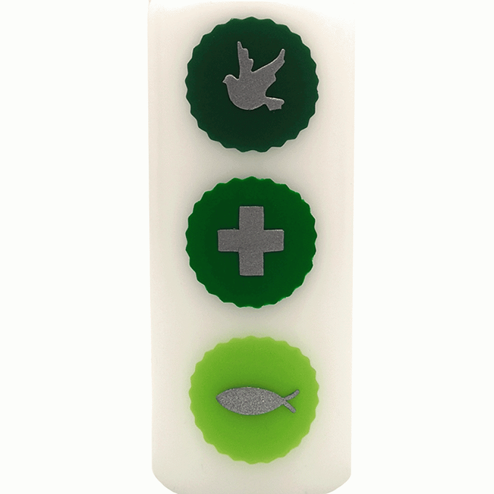 Deze Kerkkaars heeft mooi wassen reliëf in de vorm van een kruisje, vis en duif