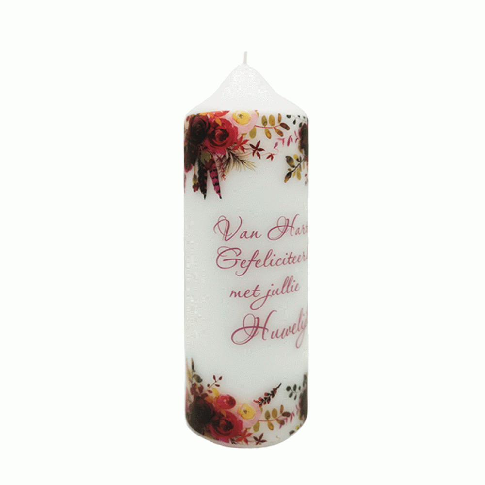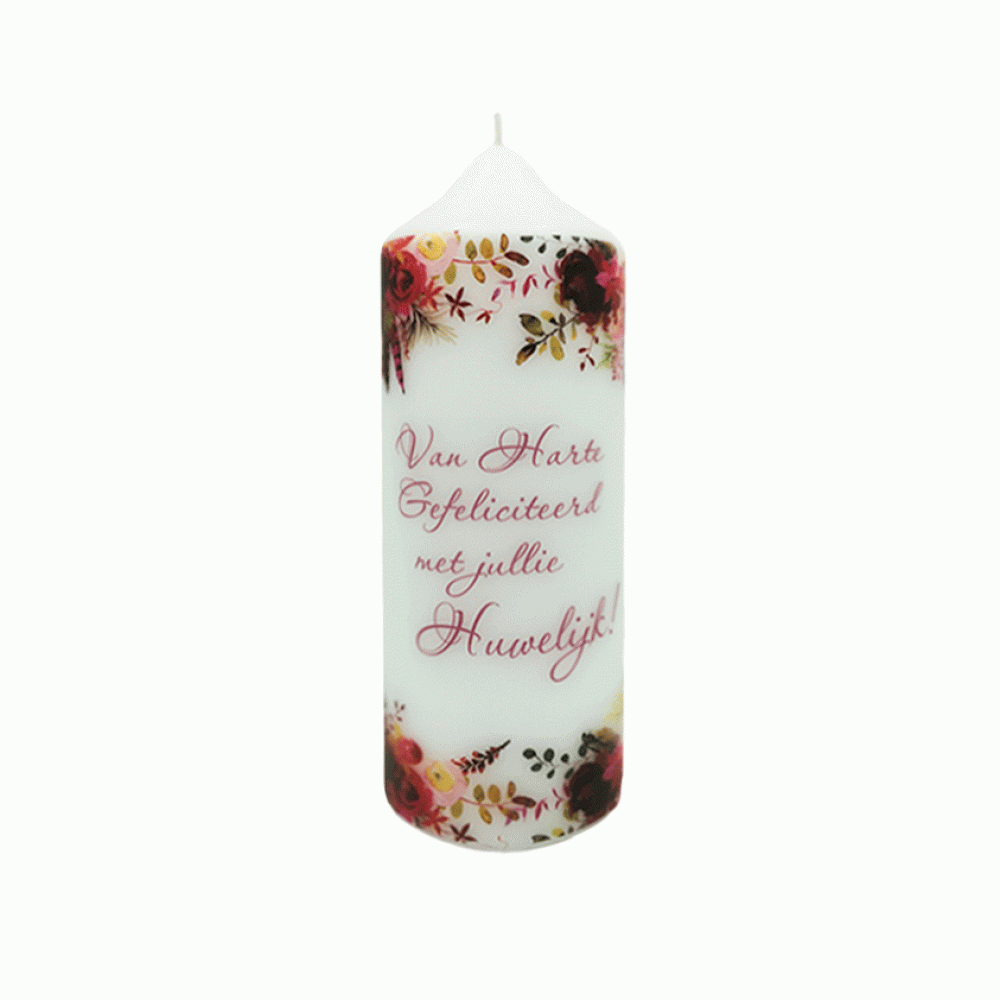 Huwelijkskaars met felicitatie voor het huwelijk. Met deze kaars als cadeau hebt jij geen huwelijkskaart meer nodig. Super romantische trouwkaars. Ben je opzoek naar trouwkaarsen als stijlvolle decoratie voor bruiloft? Of ben je op zoek naar een huwelijkscadeau dan is deze kaars echt voor jou. We verpakken deze kaars in handige cadeau folie voor een mooie uitstraling. Elke kaars is een uniek kunstwerk, deze absoluut schattige trouwkaars is een origineel eigen design kaars. Moderne trouwkaarsen mogen dan niet ontbreken op trouwdag! Alle huwelijkskaarsen maken wij met de hand. Deze exclusieve kaars is door het eigen design zeer exclusief.